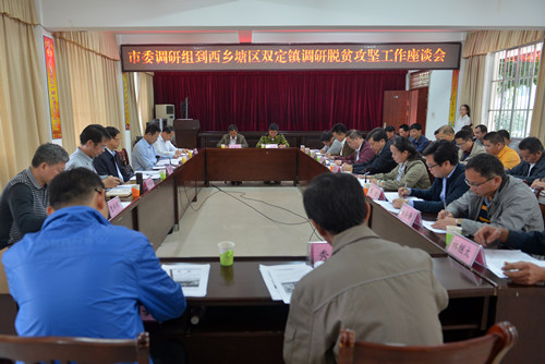 实地调研结束后,冯学军一行在双定镇政府召开了调研座谈会。廖伟福、谭哲、双定镇两个贫困村第一书记、贫困户代表等先后在会上作了关于扶贫工作的情况汇报。冯学军认真听取了汇报并和大家进行深入交流。冯学军要求,西乡塘区党委、政府要切实按照自治区和市委关于精准扶贫工作的部署要求,扎实推进精准扶贫各项工作,积极做好扶贫产业发展规划和扶贫项目,为工作的顺利实施打好基础;还要根据贫困村发展规划,充分整合资源,加强协调联动,助推当地的扶贫产业均衡发展,带动群众脱贫致富。