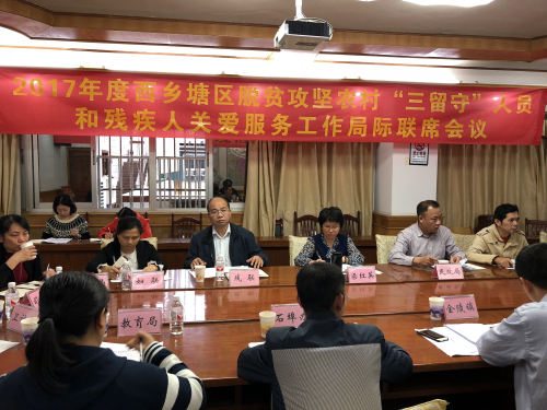 会议研究解决了2017年度西乡塘区脱贫攻坚农村“三留守”人员和残疾人关爱服务工作中存在的困难和问题,并对下一步工作进行了部署安排。会议要求,城区各相关部门要提高认识,以高度的政治责任感和强烈的历史使命感切实抓好脱贫攻坚农村“三留守”人员和残疾人关爱服务工作。在具体的实施过程中加强部门之间的沟通协作,做到信息互通。突出重点,着力解决农村留守儿童监护缺失及无户籍儿童的落户等问题。落实经费、人员、设施和考核机制保障,全力做好关爱农村“三留守”人员和残疾人关爱服务工作。