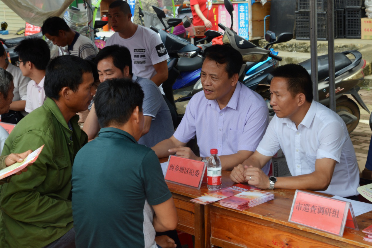 为充分发挥人大代表、政协委员、民主党派人士 、无党派人士、特邀监察员的民主监督职能,不断推动扶贫领域监督执纪问责工作深入开展,9月7日,由市纪委常委、监察局副局长蓝江河带队的市巡查调研组一行8人到我城区开展调研工作。当天上午,市巡查调研组亲临坐阵,城区纪委监察局和住建局、扶贫办等14个涉农部门参与,在坛洛镇开展扶贫领域监督执纪问责公开大接访活动。